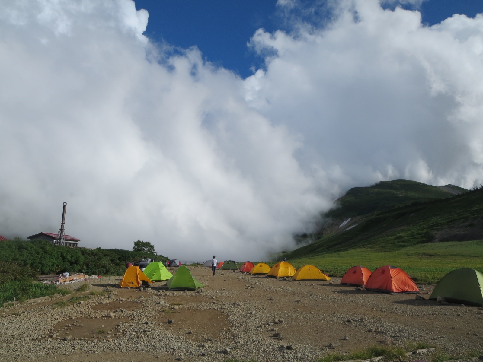 あっという間に白の世界、遠くに雷鳴が聞こえる。しかし短時間で又霧が晴れ雷にもならずあまりぱっとしない夕焼けだったが夕焼けも見る事が出来た。満天の星は見られなかった